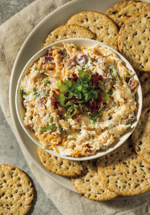1 tablespoon granulated garlic ¼ cup well-drained crushed pineapple Chips Combine the mayonnaise, sour cream, whipping cream, softened cream cheese and grated Gouda cheese using a stand mixer. Add remaining ingredients and mix until combined.